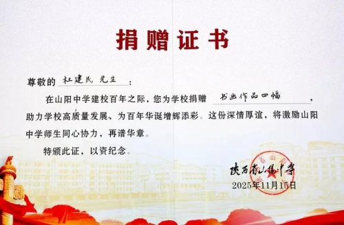 杰出校友、著名艺术家杜建民先生受邀出席陕西山阳县中学百年校庆开幕式,并于11月16日在校庆庆典期间,携60余幅精品力作,呈现“醉美山阳”!为感恩母校栽培,杜建民先生特捐赠4幅代表性作品。此次展览打破地域限制,以流动美术馆形式呈现,是一堂生动美育实践课,为百年校庆增添了浓墨重彩的一笔。