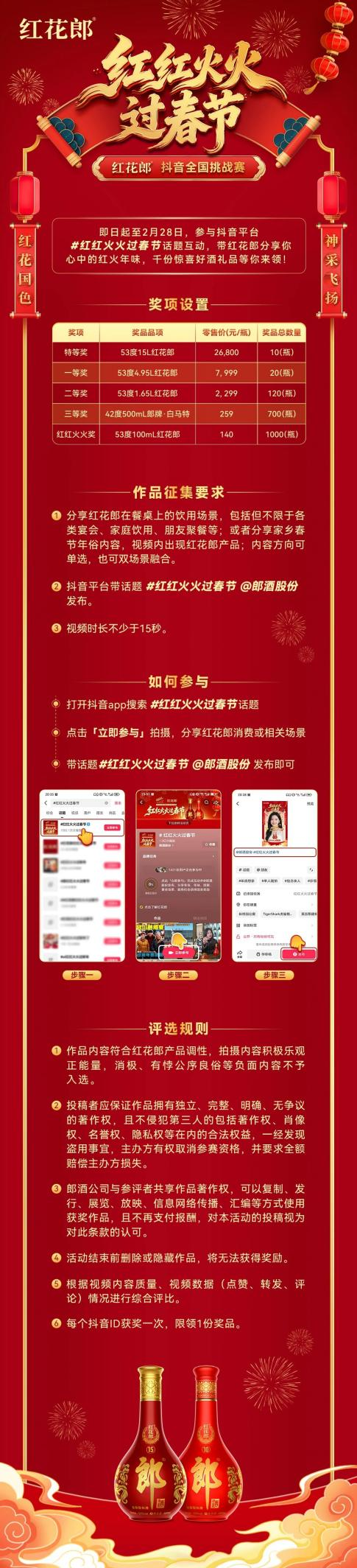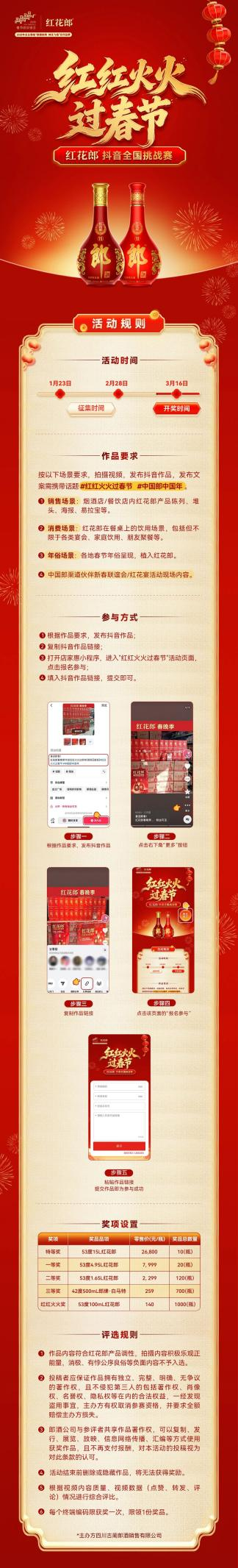 新春将至,年味渐浓。红花郎以“红红火火红花郎,红红火火过春节”为主题,在抖音、微博等多平台发起系列线上互动活动,通过百万大奖征集、全民挑战等形式,成功营造出浓厚的云端新春氛围,与全国消费者共品红火年味。