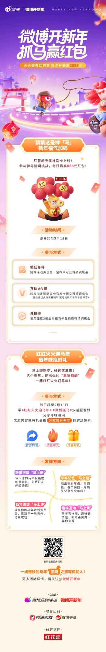 为礼赞新春,回馈消费者,红花郎设置了丰厚的活动奖励。抖音平台的“百万大奖互动征集”正在火热进行中,邀请用户分享红火年味,瓜分现金大奖;同时,在微博平台开展的“开新年 抓马赢红包”活动将持续至2月16日,参与者通过晒出年味瞬间,即有机会赢得888元新春红包,为佳节再添一份惊喜。
